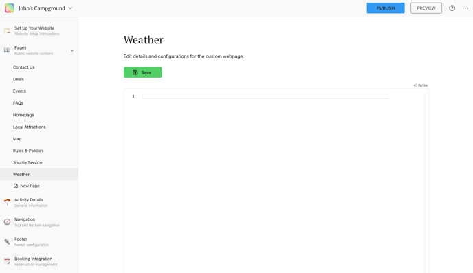 The first thing you'll want to do to add a weather widget to your site is create a new custom page, then select HTML, for more information on this first step check out this article: Making a Custom Page. Once you have your new page you should be looking at a totally blank slate like the image below (for this demo I named the page Weather):