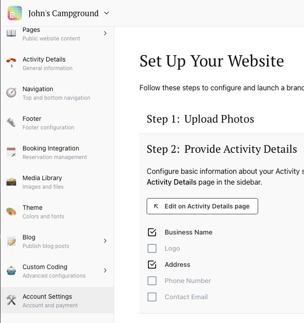 - The first thing you need to do to get your site running is navigate to the Account Settings tab in the sidebar.