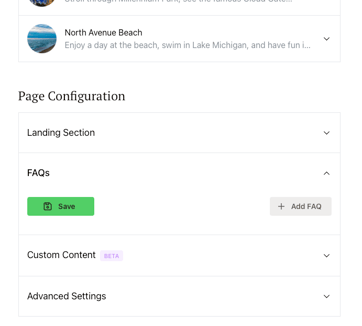 In order to get started creating your own, navigate to the page you want to edit and go to the Page Configuration section. From there open the FAQs tab. There you can add an FAQ.