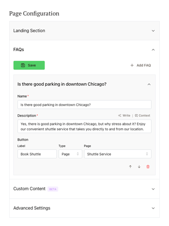 After adding an FAQ you can expand it and change the Name (question or title of FAQ dropdown) and the Description (answer or information inside the dropdown). You are also able to add a button to the FAQ to link out to a URL or a different page. If you need to delete or rearrange FAQs use the buttons in the bottom right.