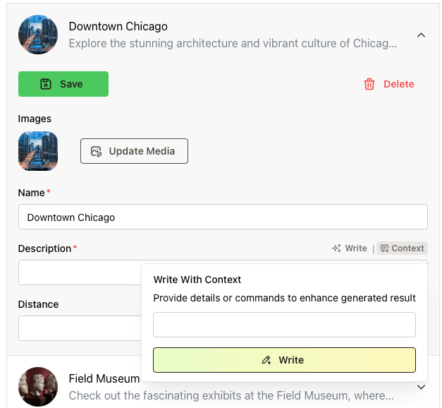 Often, creating copy for websites is difficult. It's hard to come up with exactly what you want to say. With our Write and Context buttons coming up with copy can be as easy as a press of a button. Click the write button to have content generated for you based on your brand's personality.